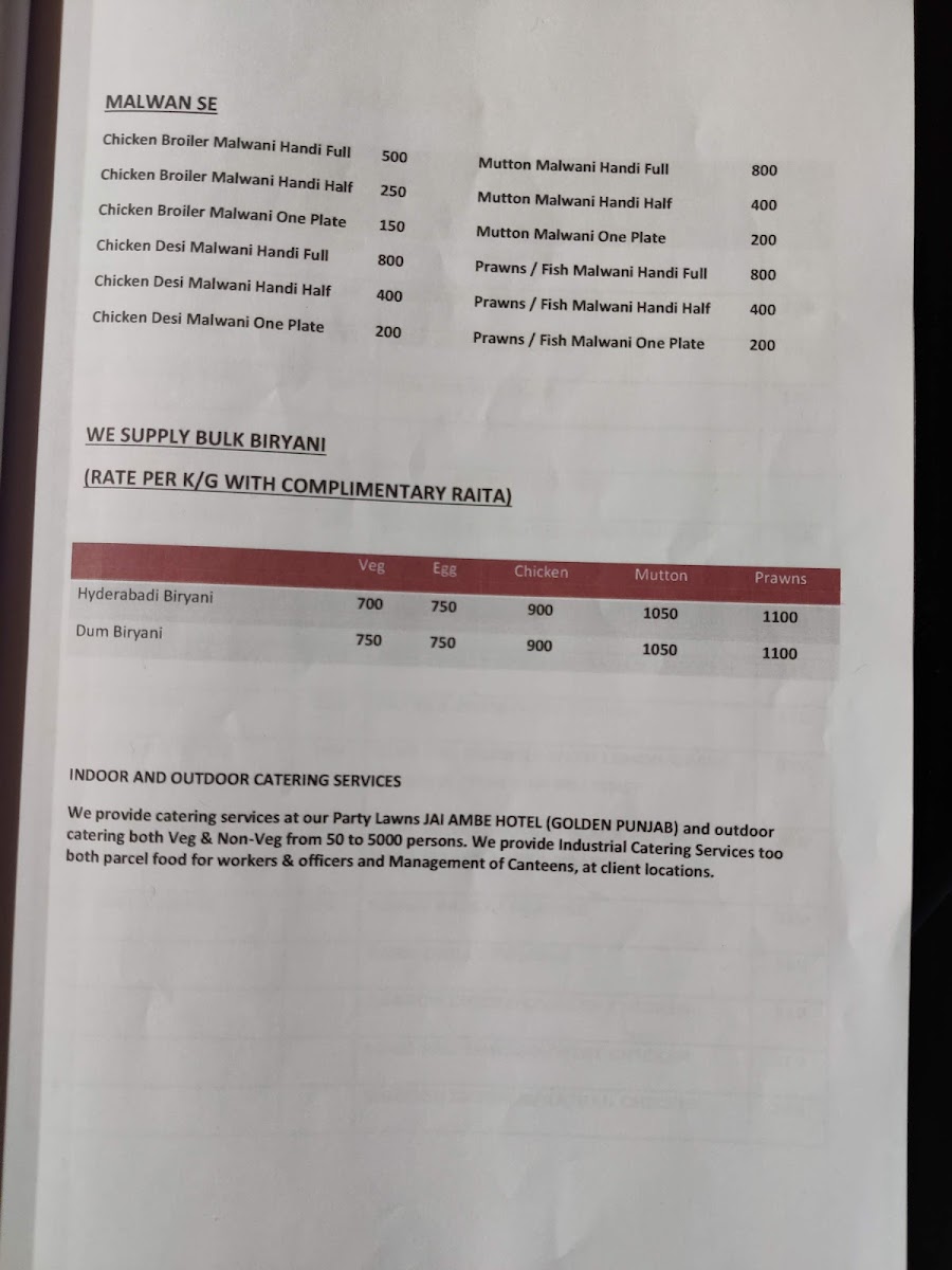 Welcome to Golden Punjab Hotel, a gem nestled on State Highway in Ambernath, Maharashtra. This restaurant stands out with its vibrant ambiance and a menu rich in flavors, particularly renowned for its tantalizing non-vegetarian Chinese starters like Chicken Manchurian and Prawans Golden Fry. The variety ranges from Chicken Tangdi Kabab to the exquisite Surmai Fish Tawa, ensuring there's something for every palate.